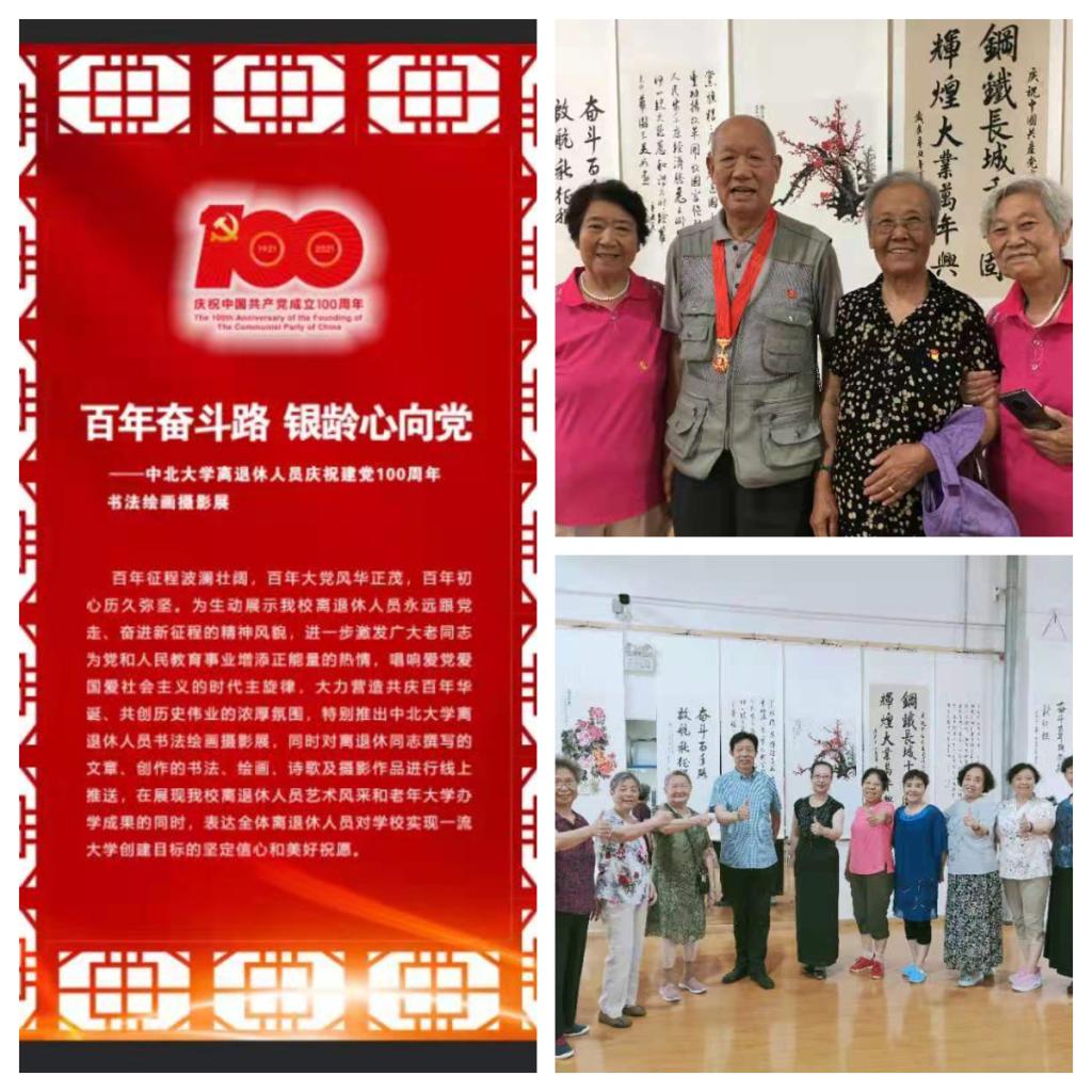 为生动展示我校离退休人员永远跟党走、奋进新征程的精神风貌,进一步激发广大老同志为党和人民教育事业增添正能量的热情,唱响爱党爱国爱社会主义的时代主旋律,大力营造共庆百年华诞、共创历史伟业的浓厚氛围,七一前夕,离退休人员管理处党委在老年活动中心三层多功能厅举办了“百年奋斗路 银龄心向党”----中北大学离退休人员庆祝建党100周年书法绘画摄影展。