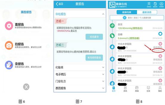 当用户在校医院体检中心完成体检后,10个工作日后可登陆康康在线,点击查报告,查询本次体检报告和既往体检信息(如图6)。