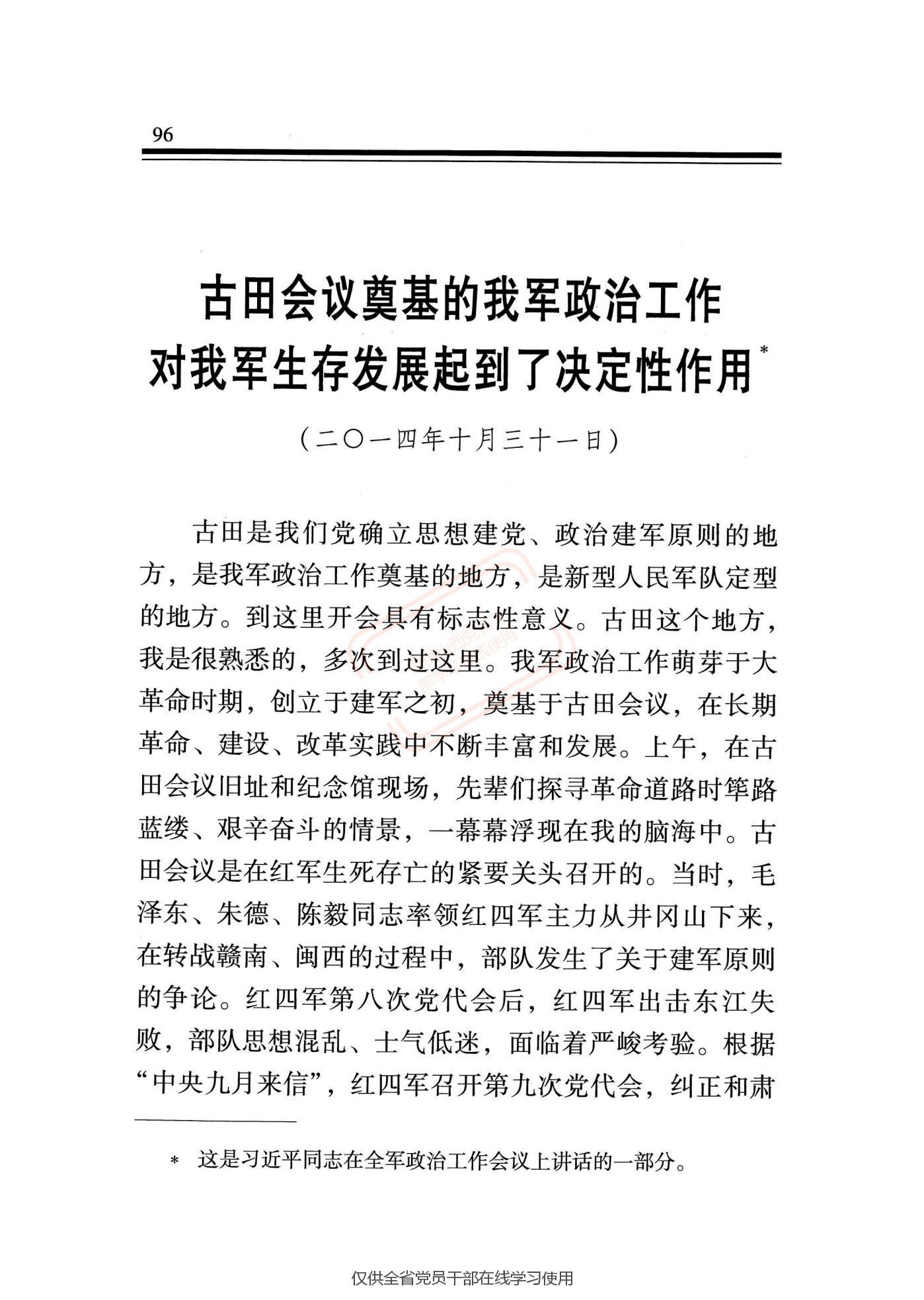 《古田会议奠基的我军政治工作对我军生存发展起到了决定性作用》是2014年10月31日习近平同志在全军政治工作会议上讲话的一部分。指出:古田会议纠正和肃清各种非无产阶级思想,形成了我党我军历史上著名的古田会议决议。这次会议确立了马克思主义建党建军原则,确立了我军政治工作的方针、原则、制度,提出了解决把以农民为主要成分的军队建设成为无产阶级性质的新型人民军队这个根本性问题的原则方向。古田会议使我们这支军队实现了浴火重生、凤凰涅槃。从那儿以后,在党领导下,我军由小到大、由弱到强,不断从胜利走向胜利。古田会议奠基的我军政治工作对我军生存发展起到了决定性作用。