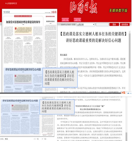 《山西日报》11月3日“学习周刊”要论版刊发了我校党委书记沈兴全署名文章:《讲好思政课最重要的是解决好信心问题》。