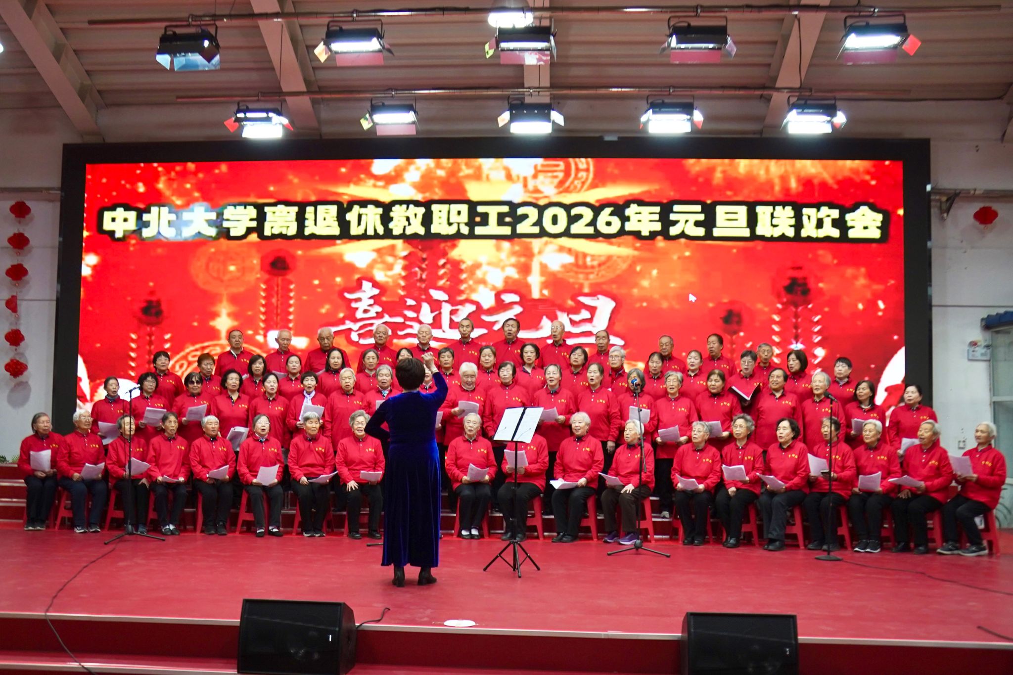 时序更替,华章日新。在2026年元旦佳节来临之际,离退休工作部精心筹备的元旦联欢会在全新升级的老年活动中心温情启幕。新建成的高清LED屏幕流光溢彩,新翻修的舞台整洁雅致,近300名离退休老领导、老同志欢聚一堂,在欢声笑语中共贺新年、共话情谊、共叙发展。校党委常委、 党委副书记赵文军、离退休工作部党委书记、部长郭书杰及相关职能部门负责人出席活动,向老同志们致以最诚挚的节日祝福。
