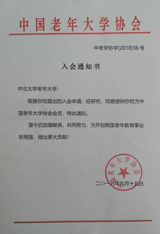 近日,我校老年大学收到了中国老年大学协会入会通知书,正式成为中国老年大学协会会员。